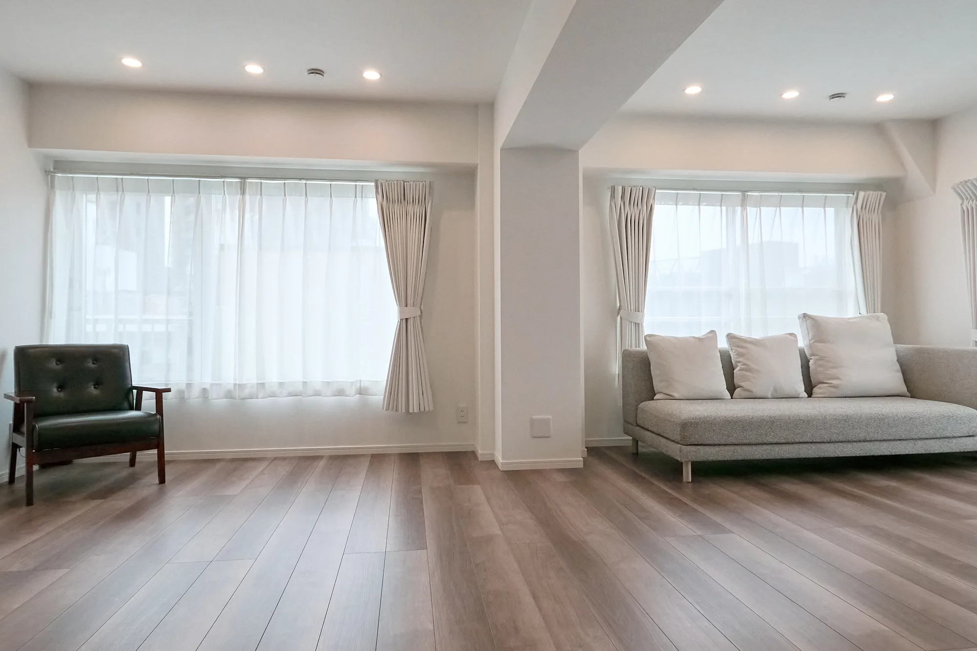 - 3面の大きな窓から自然光がたっぷりと入り、南向きの窓が2面と西向きのバルコニーへのアクセスが可能な窓が1面あります。